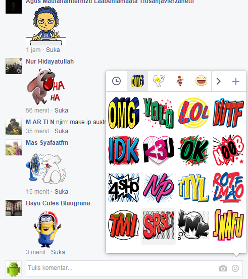 Hari ini tepatnya tanggal 14/ 10/ 2014 seluruh wall di facebook mendadak jadi ramai, ada apa gerangan? keramaian ini di karenakan hadirnya fitur sticker pada komentar facebook, biasanya sebagai pengguna facebook kita hanya bisa menggunakan sticker lucu pada pesan fb saja, yaitu saat ngin melakukan chatting bersama teman melalui inbox/ kotak masuk fb.